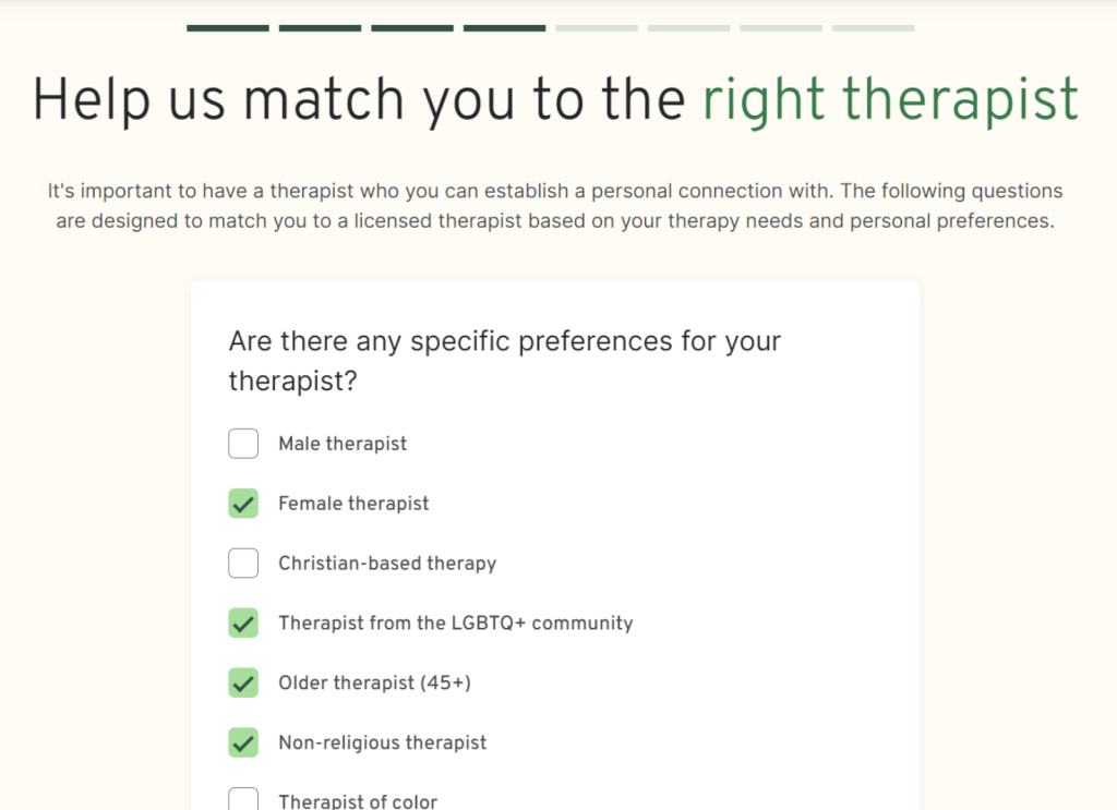 BetterHelp uses an algorithm that’s designed to connect users with a suitable therapist. Unlike some other platforms, users cannot choose their therapist directly, though. Instead, the algorithm considers factors like your location, therapist availability, and the preferences you indicate during signup: