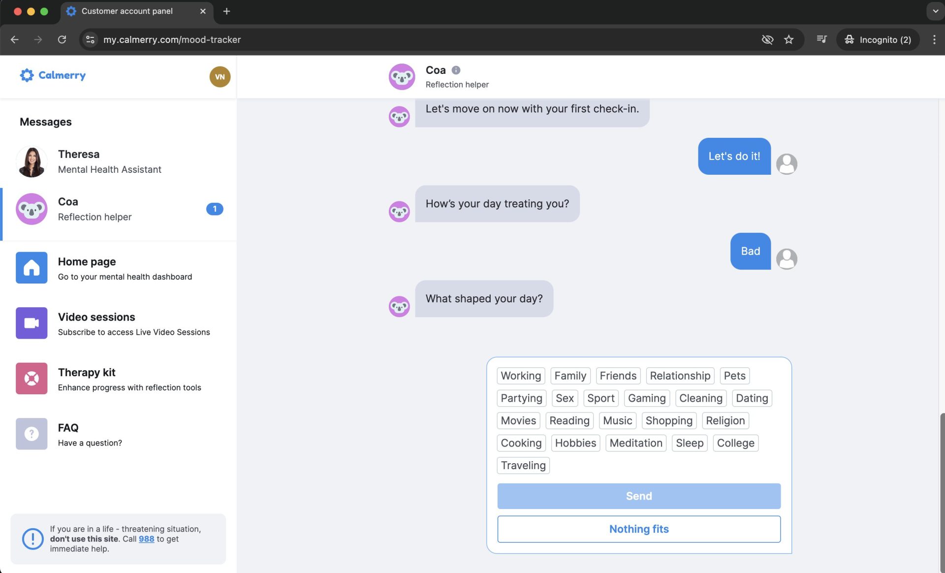 Calmerry users also get access to a reflection chatbot named Coa. The tool provides daily mood check-ins and journaling prompts and then tracks your mood journal over time.