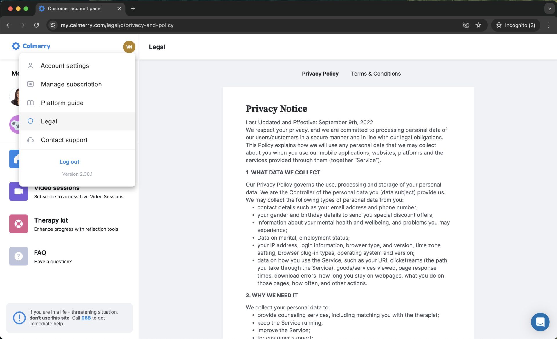 We read through various versions of Calmerry’s privacy policy and terms of use. Depending on whether users are logged in or not, they may be accessing different versions of the platform’s data and privacy documentation. We found links to versions as old as October 28, 2020, and as recent as June 15, 2024.