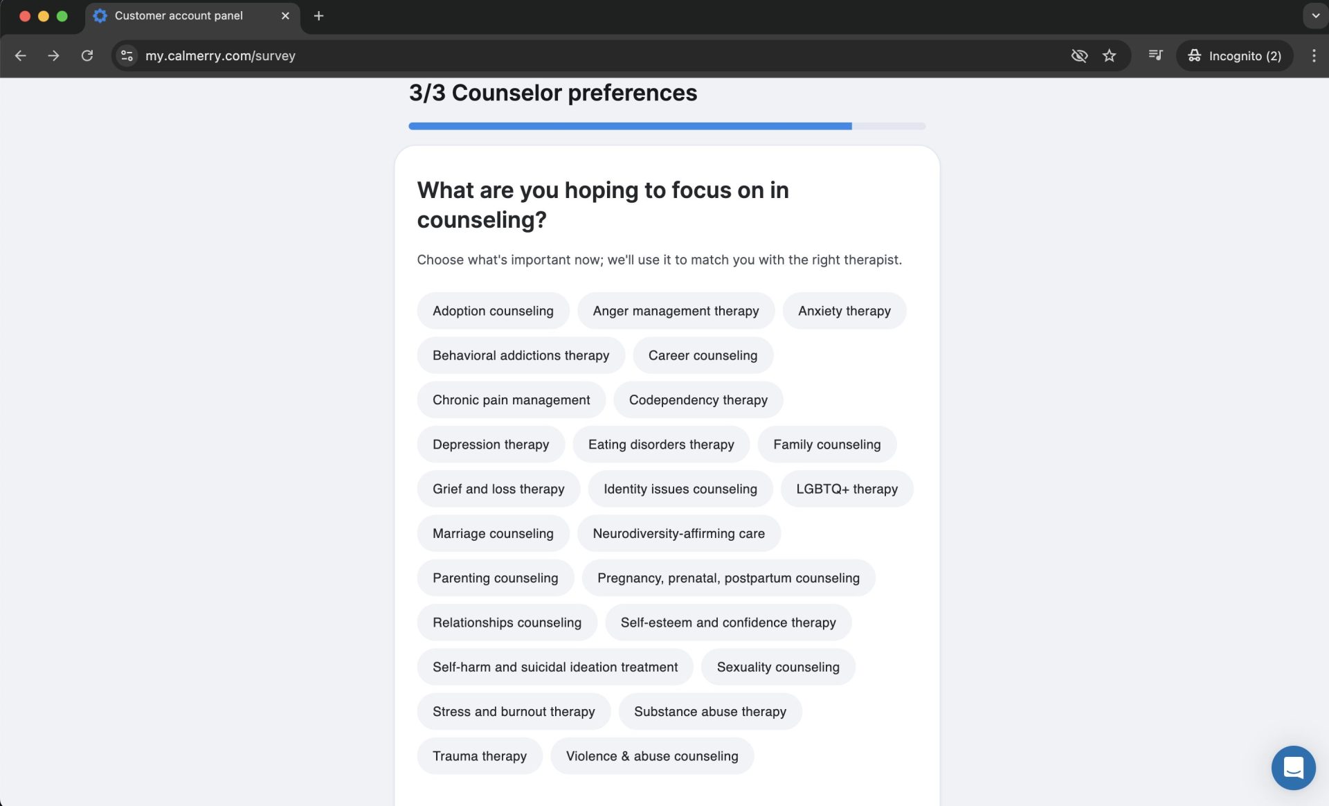 Based on our testing and research, Calmerry matches users with a provider based on the provider’s gender identity and what issue or issues they want to work on. The platform then gives users a choice between getting matched by the internal system, or choosing from a handful of providers.