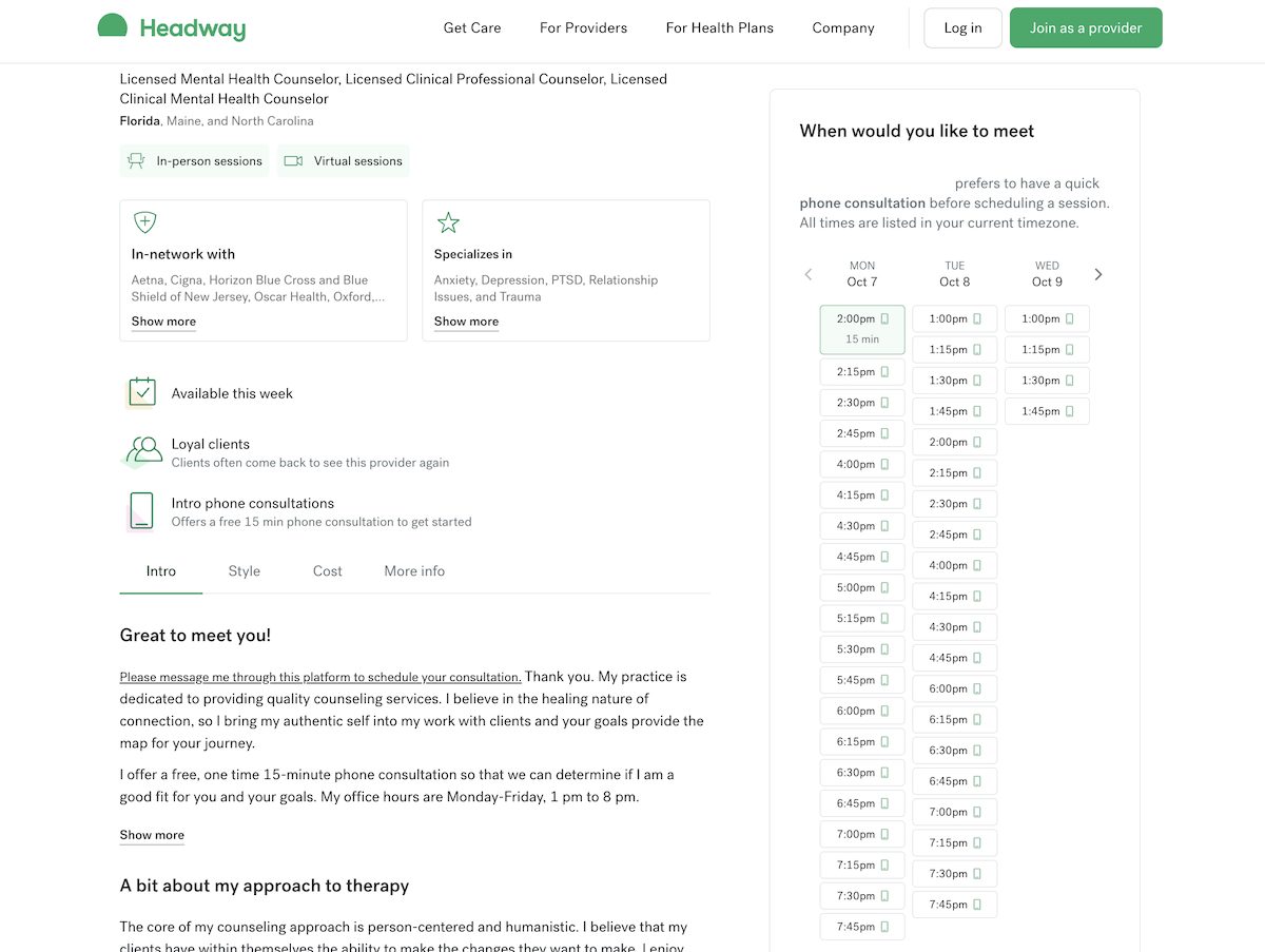 Patient care is personalized to the client. The way you communicate with your therapist, the length of your sessions, and cancellation policies vary based on each individual therapist. Headway hosts providers who can treat a number of mental health conditions, including anxiety, depression, grief, eating disorders, and post-traumatic stress disorder (PTSD). You can use the site’s search filters to find and select your therapist based on a specific condition, with options for gender, ethnicity, and available appointment times.