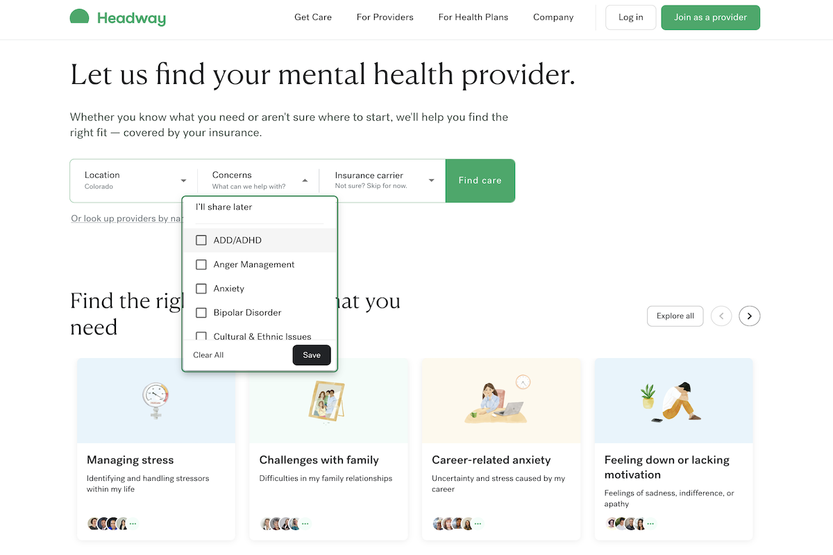 Headway is a simplified source for locating therapists. The site doesn’t include any bells and whistles like chat functionality or videos. Yet for what it offers to patients who need to use their insurance to pay, Headway is a stable and straightforward option.