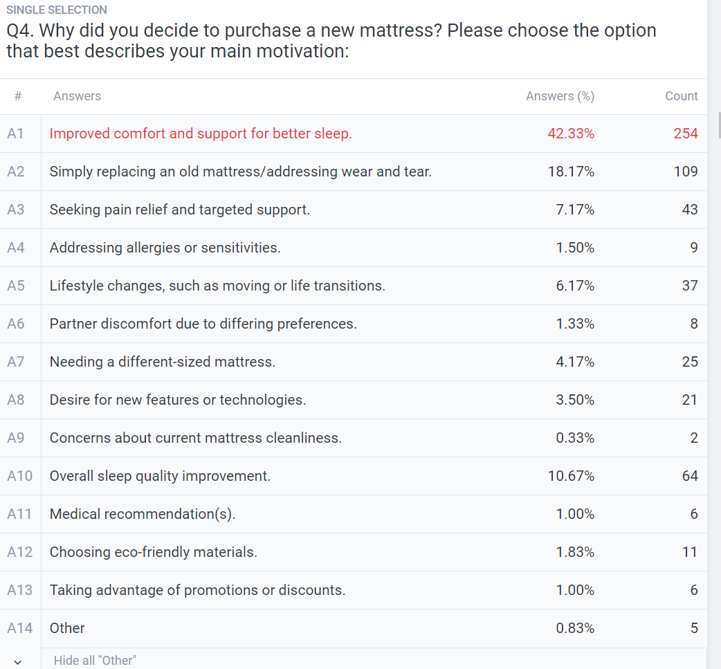 We also asked respondents about their sleep preferences and what features they prioritize. This helped us build our testing strategy and compare mattress characteristics that matter most, like composition, firmness, and pressure relief.