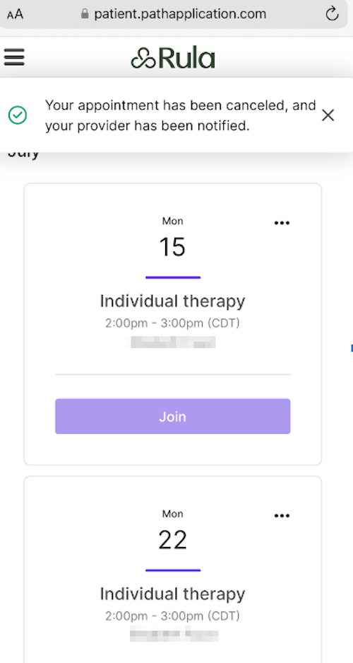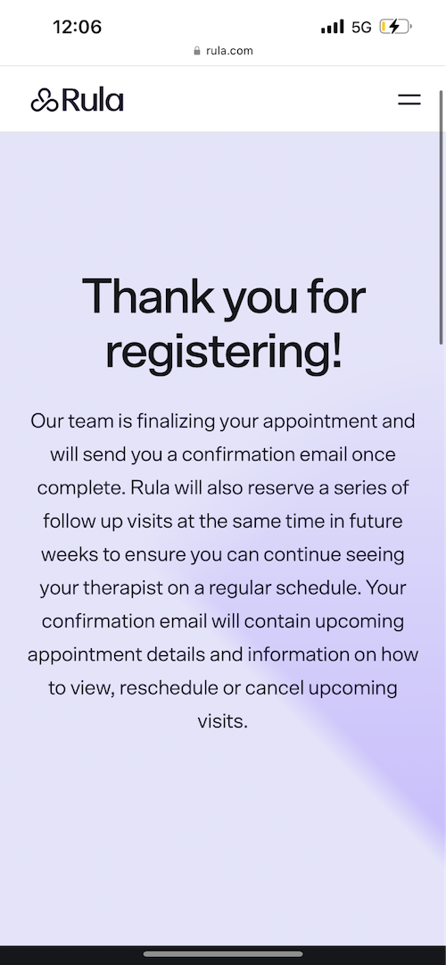 One of our Rula testers notes, “I appreciate that Rula’s providers are relatively easy to book with. I was able to schedule an appointment on a Friday for the following Monday. I also love that Rula makes it easy to schedule, change, and cancel appointments.”