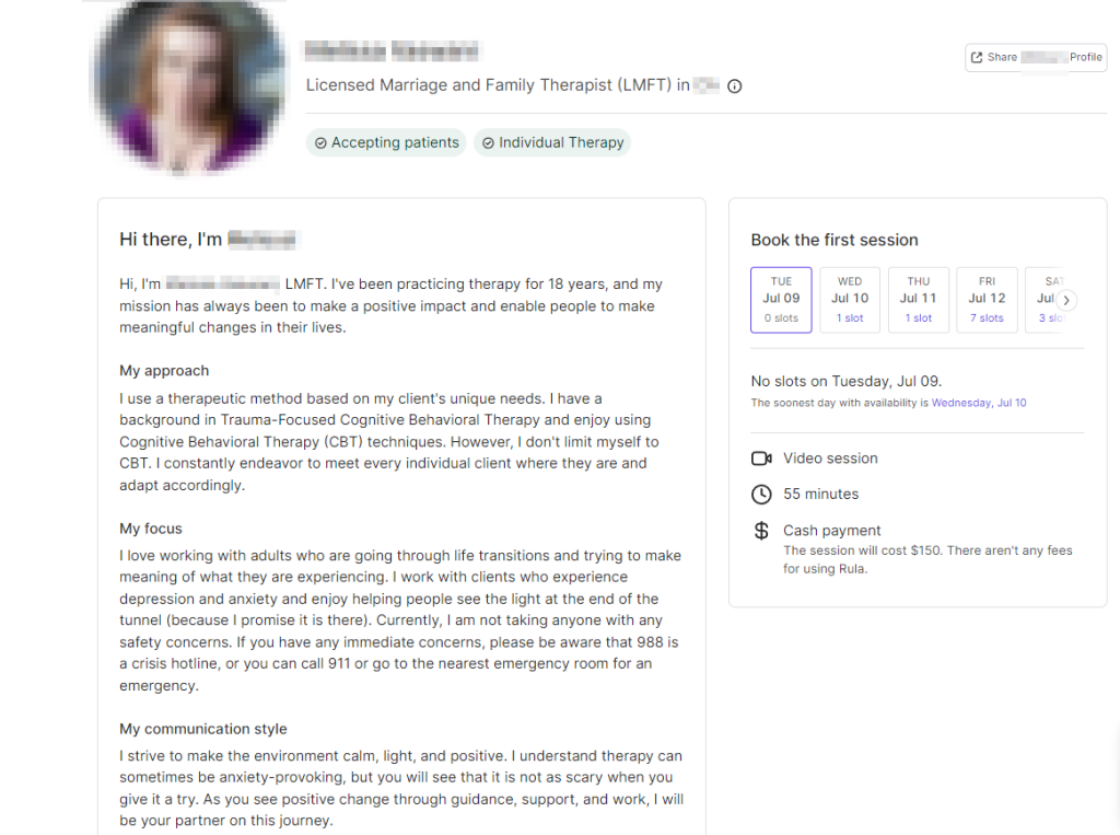 Rula uses the responses from your intake process to provide you with a list of potential therapist matches. You can review their extensive bio information and choose the provider that appears to be best suited for your needs.