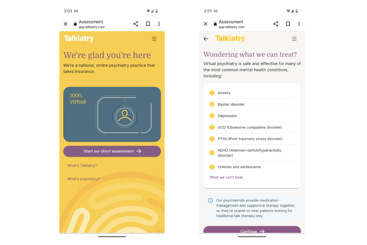 Online psychiatry is not right for everyone. If you are seeking psychiatric care for the first time, or if you are dealing with one of the listed conditions that Talkiatry does not treat, you should consider seeing a psychiatrist in person first for a full evaluation.