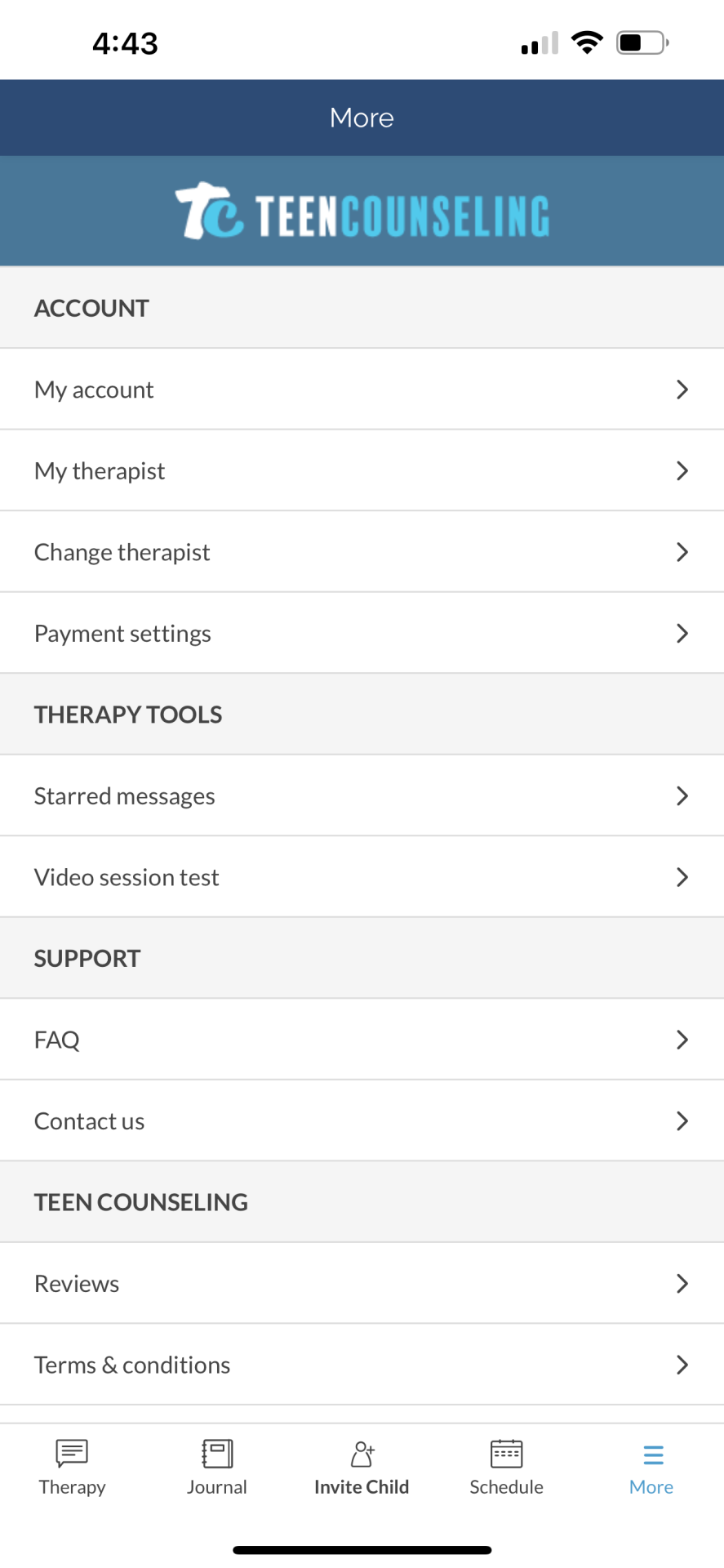 Typically, a parent signs up for Teen Counseling and can then invite their teen, who will receive an invite code to login to the platform via email and text message. Interested teens can also use the platform to submit a request to their parents to be matched with a therapist.