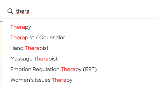 The platform’s mental health care options include individual therapy, couples therapy, family therapy, and psychiatry. Within those categories, Zocdoc offers several subcategories. For example, when you type “therapy” in the search bar, results include general options like “therapist/counselor” or more specific options like emotional regulation therapy (EMT), mindfulness-based cognitive therapy (MBCT), or cognitive behavioral therapy (CBT).