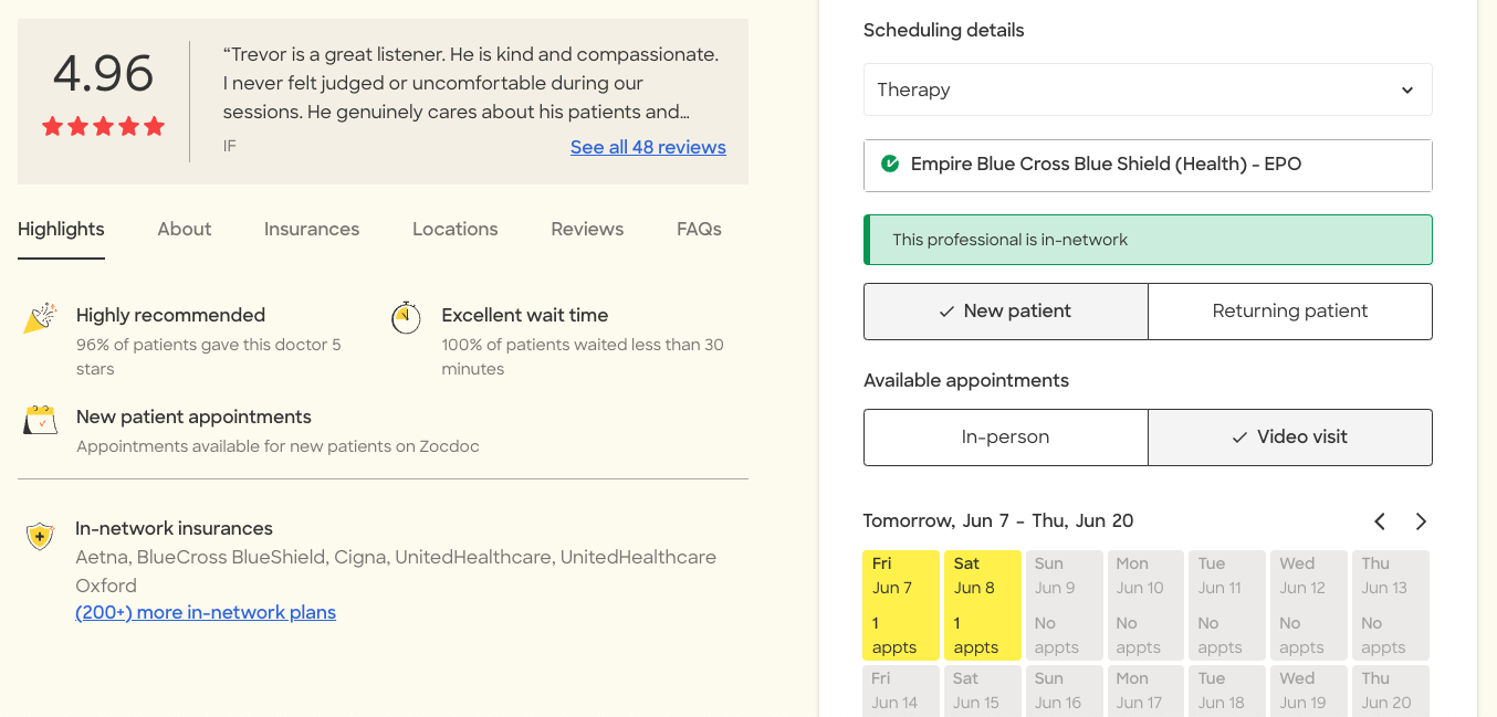 We recommend this platform for people seeking telepsychiatry or online therapy that takes insurance. With Zocdoc, you don’t need to wait to be matched with a therapist. Every therapist has their availability listed, and you can skim through providers with same-day or next-day availability.