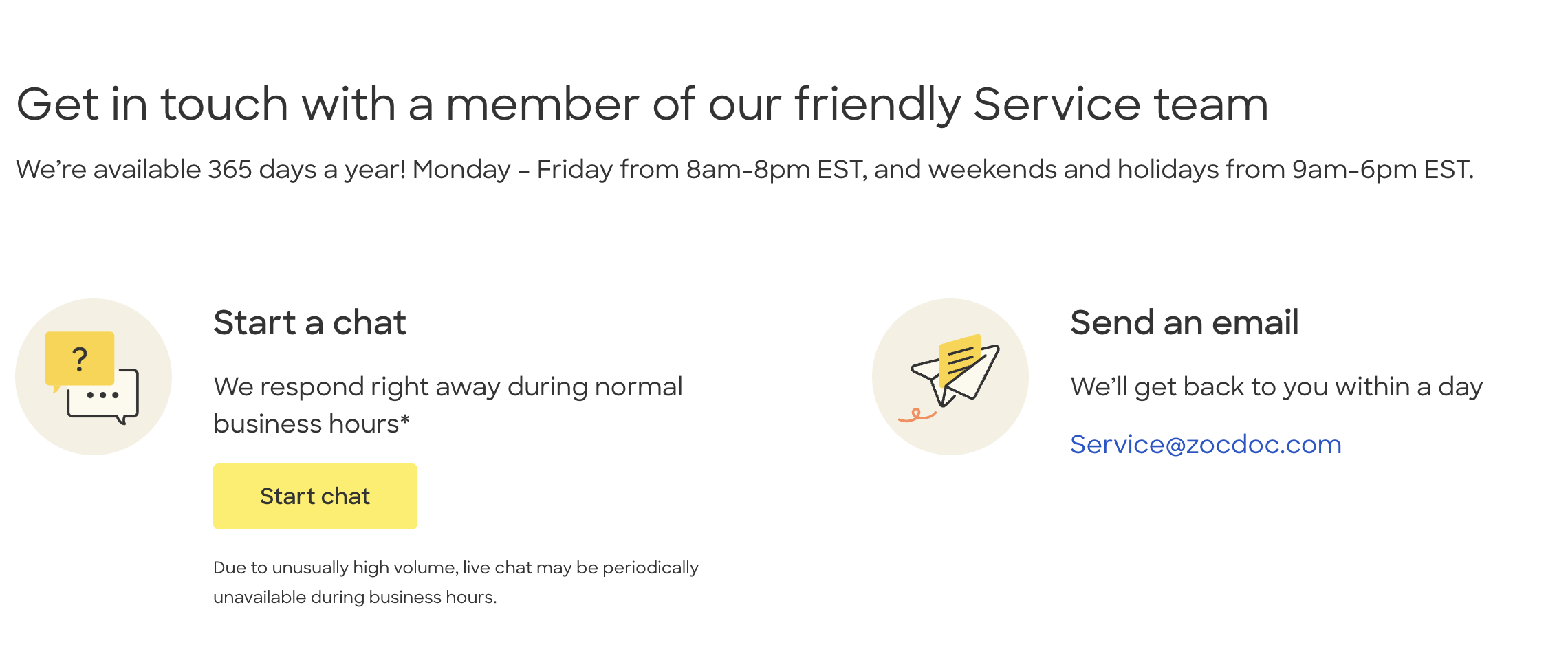One tester shares that the chat option was likely a bot because it didn’t understand their question and kept giving unrelated canned responses. However, our testers report mostly positive experiences with Zocdoc’s actual customer support team.